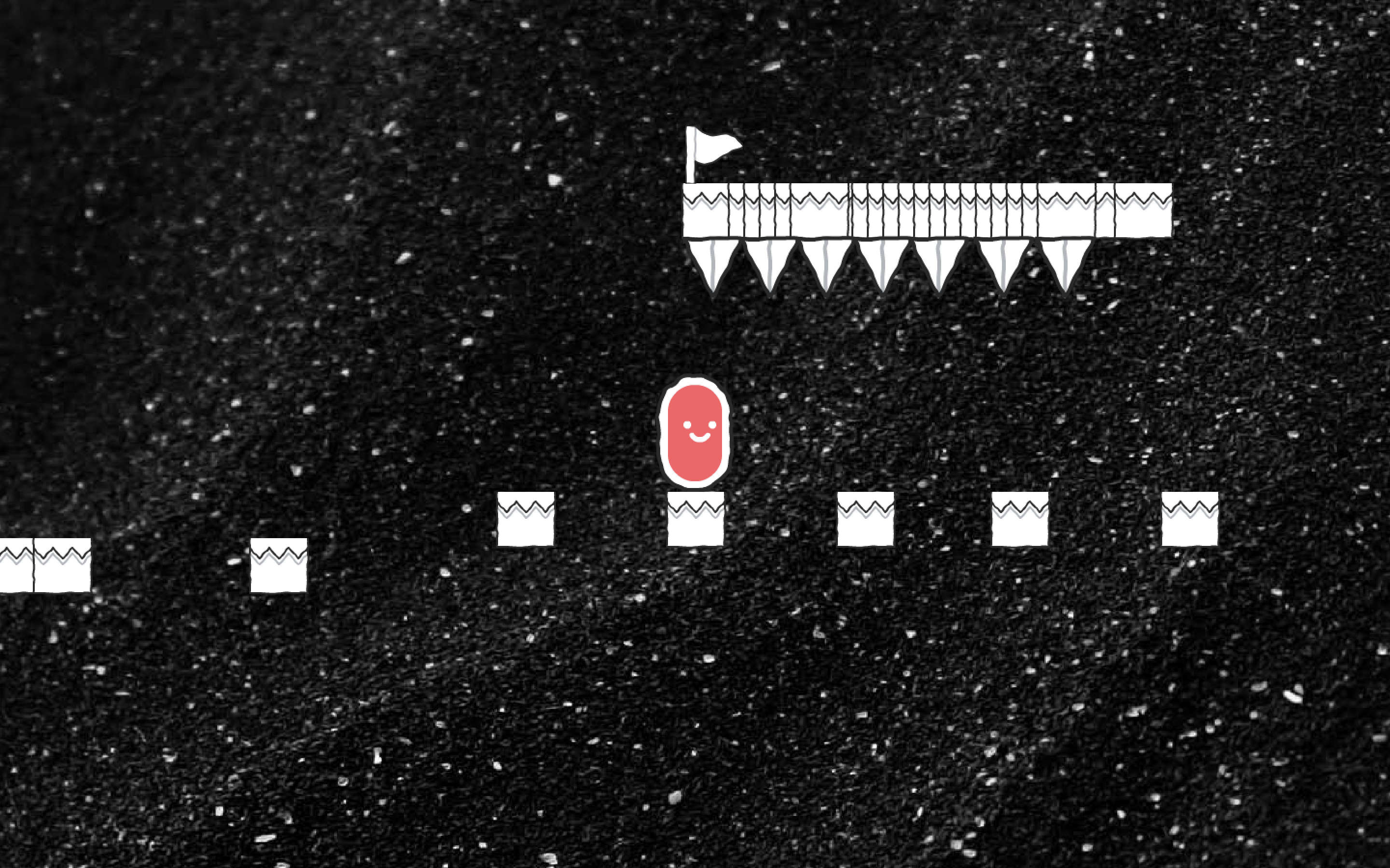 A precision-based platformer focused on pacing and timing. Players must navigate levels where platforms periodically disappear and reappear, with platform collision intact. During these moments, players gain the ability to double jump, giving them the ability to cross platforms and avoid enemies. Success depends on mastering the "glitch" and timing.